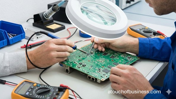 An electronics repair business fixes common problems in everyday devices. Think phones, tablets, laptops, desktops, game consoles, and some audio or display equipment.